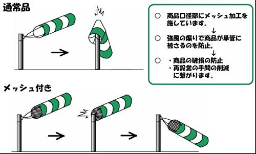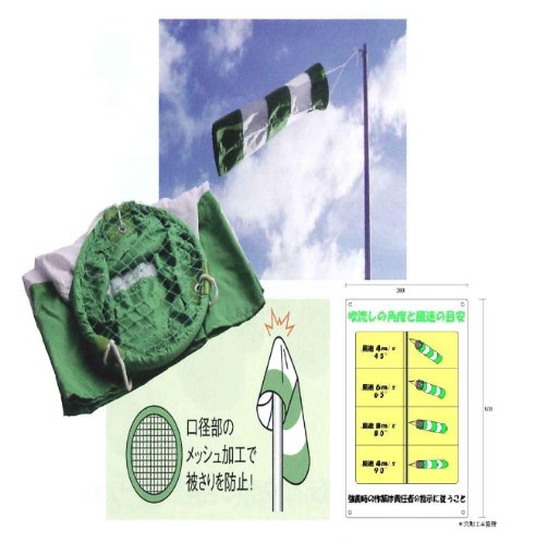 - 吹き流し仕様:ミドリ/白の2色帯 サイズ300φ×1200mm 口部分が網状になっているので、本体が竿に被って破損することを防ぎます。