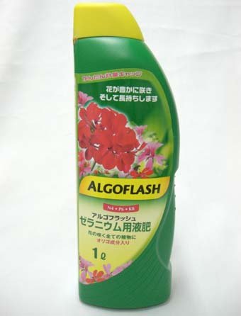 アルゴフラッシュのゼラニウム用1Lです。成分は窒素4、りん酸6、カリ8です。マグネシウム、オリゴ成分が豊富に含まれているので、花が豊かに咲くようになり、長持ちします。この商品はフランスの園芸肥料のトップメーカーで、世界記録を紹介するギネスブックの中で28個の植物世界記録を持っています。 アルゴフラッシュの肥料は、「全てを含んでいる」、 「バランスがとれている」、 「吸収率が高い」、 「純粋である」 と言う4大特長を有しています。使用方法は4Lの水にアルゴフラッシュのキャップ1杯(12cc)を生育期には2-3日に一度潅水してください。