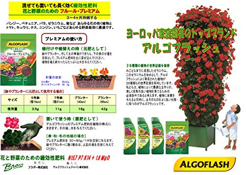 - アルゴフラッシュは、フランスの家庭園芸肥料のトップブランド。27種類の植物で育成記録のギネスレコードを持っています。 自然本来の土が持っている無機物質、銅や亜鉛、鉄、マグネシウムなども微量に含み、植物に栄養を与えるのと同時に、土壌そのものをよい状態にします。 植物に必要な栄養を全てバランスよく含んでいますので、元肥、置肥、追肥の必要がありません。また冬季(休眠期)にも使用できる固形肥料です。