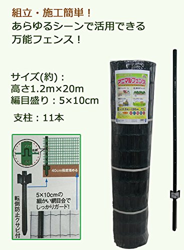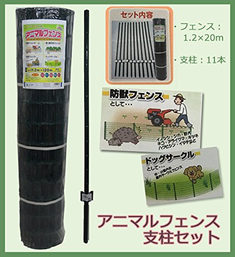 ■商品名 アニマルフェンス支柱セット ■サイズ フェンス:1.2m×20m、 目合(約)5×10cm、綿材太さ:直径2.1mm 支柱:長さ(約)1.6m(有効高さ1.45m)×11本、幅3cm×クサビ部分8.8cm ■重量(約) フェンス:13.2kg/巻、支柱:0.9kg/本 ■素材 スチール(粉体塗装) ■カラー ダークグリーン ■生産国 中国