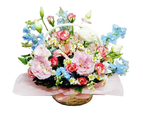 爽やかなライトブルーと可愛いピンクのアレンジ トルコ桔梗とデルフィ 日時指定無料