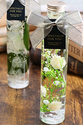 - プリザーブドフラワーやドライフラワーをガラスボトルに入れて、高品質で安全なシリコーンオイル(透明性が長く保たれ、花の色落ちも殆どなく、紫外線にも強い化粧品等、色々な物に使われている安心素材)に浸し観賞用に作られた新しいスタイルのインテリアです。可愛らしい見た目で、お部屋のアクセントや空間に彩を与えてくれます。