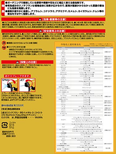 ●有効成分ジノテフランは、薬剤が直接かからなかった葉裏の害虫にも効果を発揮します。●ガーデニングで栽培している野菜や果樹や花などに花広く使える殺虫剤です。【注意事項】● 眼に入らないように注意。眼に入った場合は直ちに水洗し、眼科医の手当てを受ける(刺激性)。● つまみ菜・間引き菜には使用しない。