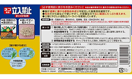●【商品説明】●「アースガーデン ネコ専用立入禁止 まくだけ粒剤 2000ml」は、猫が過剰に嫌がる植物由来成分を配合した猫専用忌避剤です。●粒状だから庭などで使いやすく、大容量なので広い範囲にたっぷり使えます。●土壌にやさしい活性土パーライトを使用しています。●猫が嫌がる成分シトロネラ、ユーカリ、中鎖脂肪酸配合。●【お問い合わせ先】●アース製薬 お客様窓口0120-81-6456製造販売元アース製薬株式会社東京都千代田区神田司町2-12-1●【成分】●パーライト(日本産)、植物精油(シトロネラ、ユーカリ、カンファ)、イソメントン、中鎖脂肪酸●【ご注意】●・用途以外に使用しない。●・体調のすぐれない時は使用しない。●・かぶれやすい人は使用しない。●・子供やペットの触れる所に置かない。●・シミ、変色の原因となるので自動車、門扉、シャッター、その他の塗装面や大理石、金属、プラスチックなどにはかからないよう注意する。●薬剤がかかった場合は直ちに洗い落とす。●・効果の持続期間は天候や温度条件により異なることがある。●・ニオイに対して鈍くなっている猫や空腹、発情...