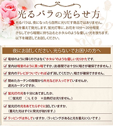 【光るバラ】蛍光灯などに照らされてから暗闇に持ち込むとバラがホタルのように光りだします。 【光らないでお困りの方へ】 ●室内は暗室のように真っ暗ですか。(お昼間では十分に暗さが確保できません。) ●蛍光灯の光を十分にあてましたか。(お花を蛍光灯に近づけてください。白熱灯×) ●蛍光灯の光をあてたらすぐに試していますか。(蓄えた光はすぐに発光が始ります。) ●ラッピングは外していますか。(ラッピングがあると光を蓄えにくいです。) ●電球のように輝くのではなく”ホタル”のような優しい光りかたです。