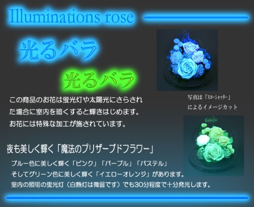 【光るバラ】。。。。 蛍光灯・LED灯などに照らされてから暗闇に持ち込むとバラがホタルのように光りだします。 光らないでお困りの方へは以下をお試しください。 ●室内は、暗室のように真っ暗ですか。室内のテレビ等も消してください。(お昼間では十分に暗さが確保できません。) ●室内に、外光が入って来ていませんか。遮光カーテン等ですか。 ●蛍光灯の光を十分にあてましたか。(お花を蛍光灯に近づけてください。白熱灯×) ●蛍光灯の光をあてたらすぐに試していますか。(蓄えた光はすぐに発光が始ります。) ●ラッピングは外していますか。(ラッピングがあると光を蓄えにくいです。) ●電球のように輝くのではなく”ホタル”のような優しい光りかたです。