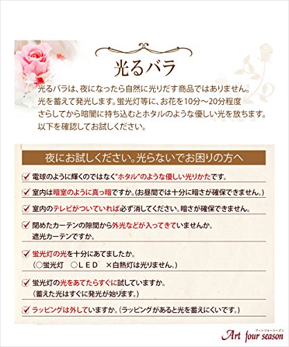 【光るバラ】蛍光灯などに照らされてから暗闇に持ち込むとバラがホタルのように光りだします。 【光らないでお困りの方へ】 ●室内は暗室のように真っ暗ですか。(お昼間では十分に暗さが確保できません。) ●蛍光灯の光を十分にあてましたか。(お花を蛍光灯に近づけてください。白熱灯×) ●蛍光灯の光をあてたらすぐに試していますか。(蓄えた光はすぐに発光が始ります。) ●ラッピングは外していますか。(ラッピングがあると光を蓄えにくいです。) ●電球のように輝くのではなく”ホタル”のような優しい光りかたです。