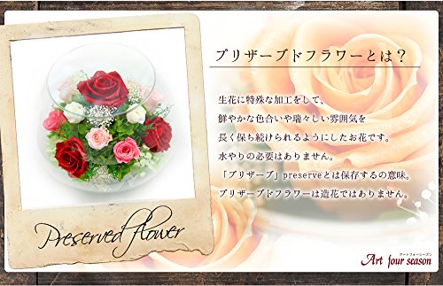 - ●プリザーブドフラワー:お花に水やりは必要ありません。 生花に特殊な加工を施してオーガニック等で染色し、柔らかな質感と自然にはない鮮やかな色合いと雰囲気を 長い間お楽しみいただけるようにしたお花です。