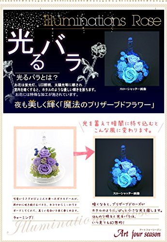 新品プリザーブドフラワー:クリアケース付き商品です。夜、蛍光灯やLED等の光をあて暗闇に持ち込むと バラがホタルのように光ります。お花に水やりは必要ありません。 生花に特殊な加工を施してオーガニック等で染色し、 柔らかな質感と自然にはない鮮やかな色合いと雰囲気を 長い間お楽しみいただけるようにしたお花です。