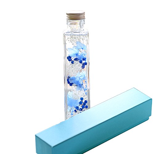 新品プリザーブドフラワー:ブルーの箱に入れての商品です。 ハーバリウムとは「植物標本」という意。プリザーブドフラワーなどを透明なオイルに浸してボトルに入れたものです。当店のハーバリウムはプリザーブドフラワーです。キラキラと光りを集める透明なガラス瓶の中でいつまでも瑞々しい。