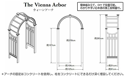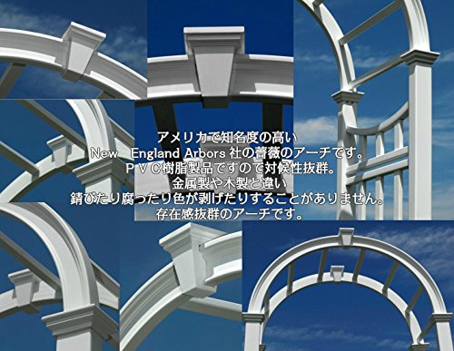 アメリカで知名度の高いNewEnglandArbor社の薔薇のアーチです。 PVC樹脂製品ですので対候性抜群。 金属製や木製と違い錆びたり腐ったり色が剥げたりすることがなくノーメンテナンスでOK。 色とりどりの花々を引き立てる真っ白で存在感抜群のアーチです。柱30㎝くらいを地中に埋め、コンクリートで埋設して設置してください。