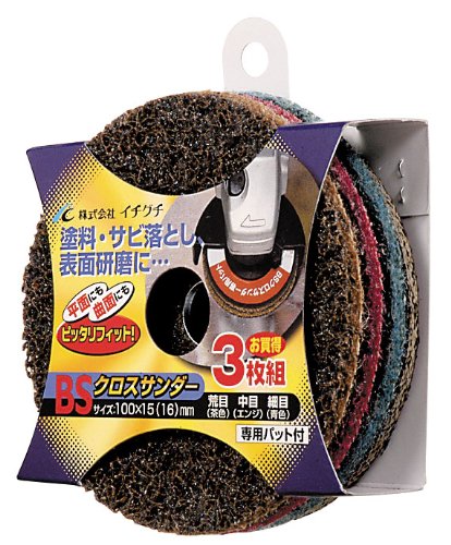 ●お試しにピッタリの3枚+パットセット。●目詰まりがなく、スムースに研磨作業ができます。●クロス製なので仕上がり抜群です。●パッケージサイズ/縦:120mm横:100mm高さ:31mm●パッケージ重量:86g●用途:塗料はがし、サビ落とし、表面研磨●粒度:荒目・中目・細目●内容量:3枚組+専用パット●直径:100mm●内径:15mm●最高使用回転数:13000rpm
