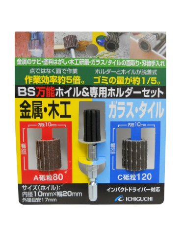 ●点ではなく面で作業、作業効率約5倍。●ホルダーとホイルが脱着式、ゴミの量が約1/5.●製品重量:24g●パッケージサイズ/縦:115mm横:100mm高さ:18mm●パッケージ重量:24g●用途:金属のサビ・塗料はがし・木工研磨・ガラス、タイルの面取り・刃物手入れ●セット内容:万能ホイルA#80/C#120/専用ホルダー×各1(A砥粒は木工・金属用・C砥粒はガラス・タイル用)●ホイルサイズ:内径10×幅20×外径目安17mm●最高使用回転数:3000r.p.m●インパクトドライバー対応●注意:最高使用回転数以下でご使用ください。軸を2/3以上入れてチャックしてください。異常音・異常振動が発生した場合は、停止してください。ご利用の工具の取扱説明書をお読みになり、製品が適合することを確認の上、ご使用ください。