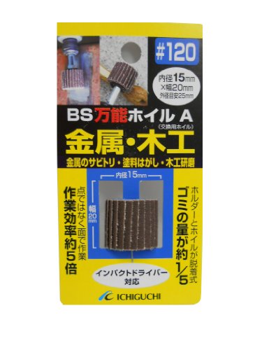 ●金属のサビ取り・塗料はがし・木工研磨に。●ホルダーとホイルが着脱式、ゴミの量が1/5.●点ではなく面で作業、作業効率約5倍。●パッケージサイズ/縦:115mm横:60mm高さ:25mm●パッケージ重量:8g●用途:金属のサビ取り・塗料はがし・木工研磨●サイズ:内径15×幅20×外径目安25mm●インパクトドライバー対応●最高使用回転数:3000rpm●注意:最高使用回転数以下でご使用ください。軸を2/3以上入れてチャックしてください。異常音・異常振動が発生した場合は停止してください。