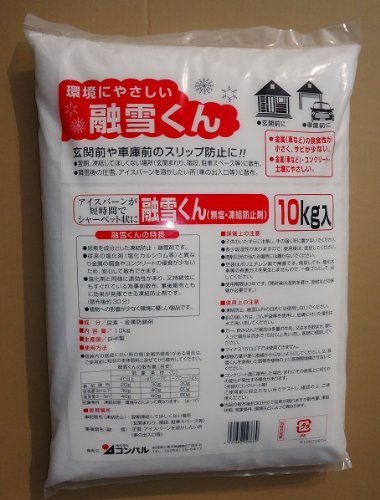 玄関前や階段、車庫前等のスリップ防止に(事前散布)。降雪後の圧雪、アイスバーンを解かしたい所にもOK。金属の腐食やコンクリートの浸食、植物の影響が少ない凍結防止剤です。