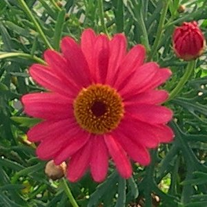 スイカ色?の複色咲きで枝垂れるように咲くマーガレットです。