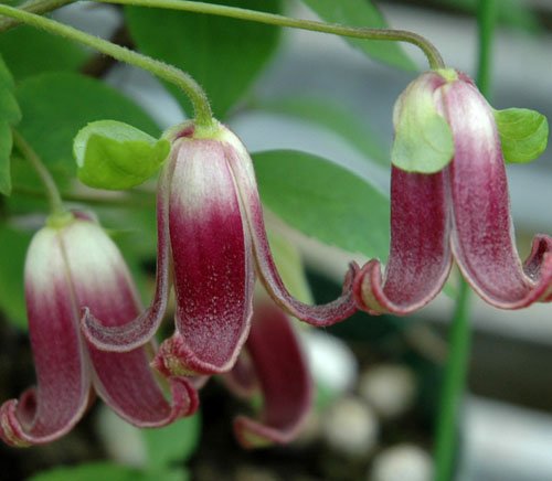 淡い赤茶色の半鐘形のお花。基部に可愛い小葉をつけるのが特徴です。野性味ある姿が魅力で紀伊半島、四国に自生する原種です。