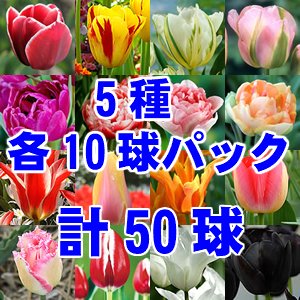 もっとお買い求め安く50球セット登場! 手軽にチューリップ三昧! 5種各10球の合計50球のチューリップをお届け! *お届け地域によっては別途送料がかかる場合があります