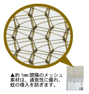 ポリエステル100%の非常に目の細かく、耐久性のあるノーシームメッシュを採用。目の細かい特殊編みメッシュは軍用テントなどにも採用されています。 ポリエステルは難燃性のため燃えにくく、火の延焼を防ぐことができます。また防虫スプレーをかけることもできます。パンツ左右部には上下に開く事が出来るファスナーが付いており長靴やシューズの脱ぎ履きが楽に行えます。ウエスト部は伸縮素材のゴム式を採用しています。メッシュポケットが付いている為携帯電話や作業用小物入れとしても便利です。またこのポケットは折りたたみ収納のポーチにもなります。 蚊や蜂は黒っぽい色を好む特性があるため白のメッシュを採用しています。 ガーデニング・ハイキング・釣り・野山での作業に最適です。