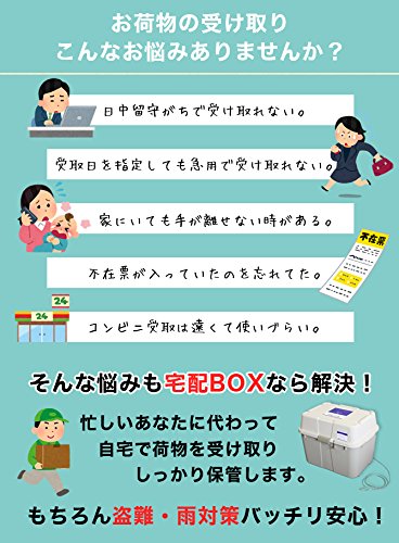 ●防犯効果を高める際は、他の防犯用品を併せてご使用下さい。 - 早く受け取りたい!そんなお悩みを解決してくれるのがこの「宅配BOX」です。ご不在の際にお荷物が届いたときはドライバーさんにお荷物を「宅配BOX」に入れて施錠してもらい帰宅したら付属の鍵で開けるだけ!シンプルな構造ですが大容量収納可能でとっても便利!スマートにお荷物の受け取りができます。
