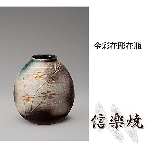金彩花彫花瓶 伝統的な味わいのある信楽焼き 花瓶 花入れ 和テイスト 陶器 日本製 信楽焼 花器 焼