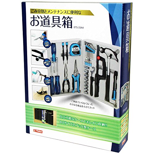 ●【商品説明】●「E-Value お道具箱 ETS-33A4」は、ごみ分別とメンテナンスに便利なツールセットです。●本棚にきれいに収まるA4サイズのブック型です。●ご家庭でいらなくなった、かさばる廃品を小さくするのに適しています。●【原産国】●台湾●【製品仕様】●用途:各種メンテナンス作業●6.35mm差込角ソケット(5.6・7・8・10・12・13mm)●6.35mm差込角ビットアダプターソケット・6.35mm差込角スピンナーハンドル●25mmビット(+1・+2・+3・-4・-6)・ドライバー(+2×100mm・-6×100mm)●精密ドライバー(+00・-1.8)・六角棒レンチ(1.5・2・2.5・3・4・5・5.5・6mm)●ラジオペンチ・万能ハサミ・金切のこ・カッターナイフ●ネールハンマー・スプレー缶パンチ・コンベックス3.5m●重量:2210g●サイズ:幅225×高さ300×奥行65mm●まとめ買いの場合、システムの仕様で個数分の送料が加算される場合がありますが、送料は1配送先につき1個分の金額となります。●システムの仕様で配達日を指定出来る...