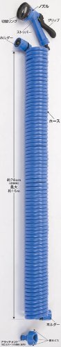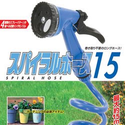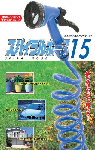・【商品名】:スパイラルホース15 ・【サイズ】:収納時:約78cm/使用時:最大約15m ・【重量】:約785g ・【材質】:ホース:EVA ノズル:ABS樹脂・合成ゴム・スチール他 ・【セット内容】:ノズル・ホース・アタッチメント/各1