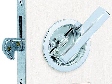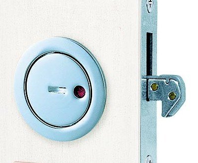 後付け用の大型サムターン表示錠セットです。錠ケースと枠側錠受けがセットになっています。工場より出荷する場合と金具の形状が変わりますので、引き戸・枠の加工穴に追加加工が必要となります。
