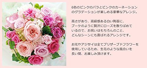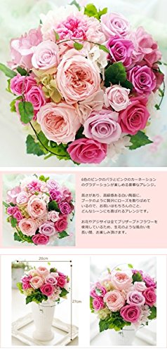 プリザーブドフラワー(preserved flower)は、生花の風合いを残し、美しい姿で、長期間保存することができるように、専用の溶液を用いて加工された花の事です。 プリザーブ(preserve)とは、英語で”保存する”という意味があり、プリザーブドフラワーは”保存された花”という意味です。 プリザーブドフラワーの寿命は保管される環境に大きく左右されますが、1~2年は美しい状態での保管が可能です。数年~10年近く、綺麗な状態で保管される場合もあるようです。 プレゼントされた方にも水やり等の負担がありません。 花粉等の心配もありません。 <取扱上のご注意> 置き場所高温多湿、直射日光、急激な乾燥が嫌いです。 バスルーム、窓際、エアコンの直風が当たる場所は避けて置いてください。水やりカビの発生の原因にもなりますので、決して水分を与えないでください。 *香水等も変色やカビの原因になります。色移り多湿時等に、もともと持つ水分が着色料と共にお花の表面にでてくる事があります。 色移りの原因になりますので、しみでた水分はティッシュなどでやさしくふきとってあげてください。お手入れホコリ等を取り除く場合は、ドライヤーの冷たい風を弱くあててやさしく吹き飛ばすようにしてください。 プリザーブドフラワーの花びらは繊細な為、気を付けて払ってあげてください。 プリザーブドフラワーは、非常にデリケートな為、加工の段階で花びらの切れ等がある場合がございます。 商品の性質上、多少の花びらの切れや葉落ちはご理解頂けますようお願い致します。