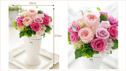 プリザーブドフラワー(preserved flower)は、生花の風合いを残し、美しい姿で、長期間保存することができるように、専用の溶液を用いて加工された花の事です。 プリザーブ(preserve)とは、英語で”保存する”という意味があり、プリザーブドフラワーは”保存された花”という意味です。 プリザーブドフラワーの寿命は保管される環境に大きく左右されますが、1~2年は美しい状態での保管が可能です。数年~10年近く、綺麗な状態で保管される場合もあるようです。 プレゼントされた方にも水やり等の負担がありません。 花粉等の心配もありません。 <取扱上のご注意> 置き場所高温多湿、直射日光、急激な乾燥が嫌いです。 バスルーム、窓際、エアコンの直風が当たる場所は避けて置いてください。水やりカビの発生の原因にもなりますので、決して水分を与えないでください。 *香水等も変色やカビの原因になります。色移り多湿時等に、もともと持つ水分が着色料と共にお花の表面にでてくる事があります。 色移りの原因になりますので、しみでた水分はティッシュなどでやさしくふきとってあげてください。お手入れホコリ等を取り除く場合は、ドライヤーの冷たい風を弱くあててやさしく吹き飛ばすようにしてください。 プリザーブドフラワーの花びらは繊細な為、気を付けて払ってあげてください。 プリザーブドフラワーは、非常にデリケートな為、加工の段階で花びらの切れ等がある場合がございます。 商品の性質上、多少の花びらの切れや葉落ちはご理解頂けますようお願い致します。