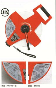 120mのひょい長メジャー、巻取り4倍速タイプ。フィールドラインガイド付(表面:サッカー場、裏面:野球場)、サイズ:長さ42.5cmx幅32.4cmx厚さ4.5cm、 重さ1.8kg、材質:ケース(ABS樹脂)テープ(グラスファイバー)、テープサイズ:幅12mmx厚さ0.48mm(片面目盛り付)、巻取り4倍速、計測図付(サッカー場、野球場)、日本製。