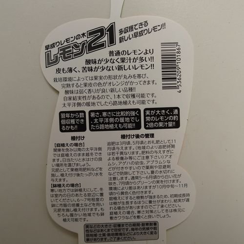 ●状態が良ければ、翌年7月頃に1~数個グリーンの実が付き、10月~11月頃色づきます。●糖度が高く香りも良い。●果汁たっぷり、一般的なレモンの約2倍。●暑さ寒さにも強い品種。●自家結実性があるので、1本で栽培可。【注意事項】関東以南の太平洋側では庭植可。その他の地方では鉢植えにして、冬は室内のよく日の当たる窓辺に置いて下さい。