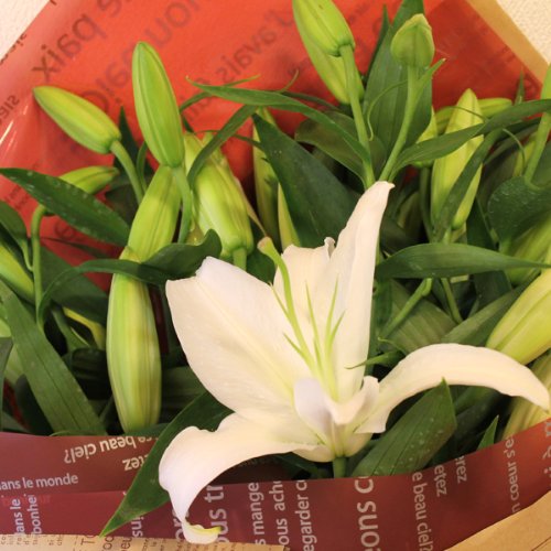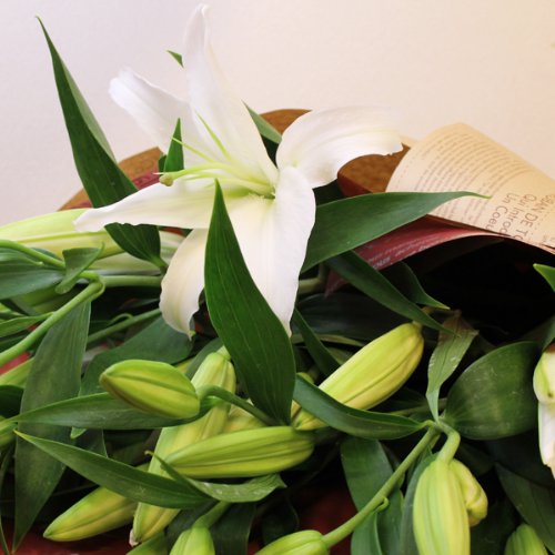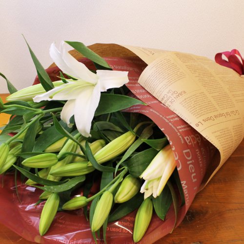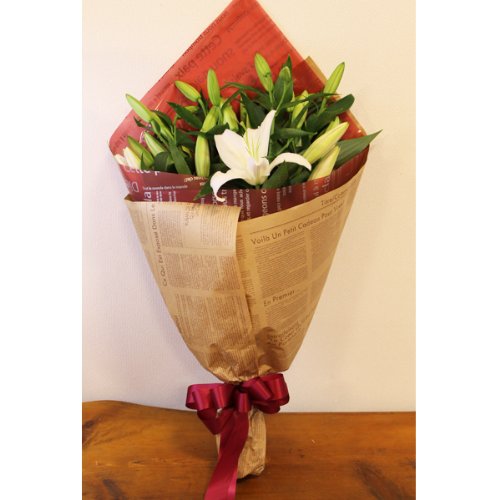 [エルフルール]ボリューム満点 オリエンタルユリの花束 5本 20輪以上 カラー:ホワイト フラワーギフト 生花 誕生日 還暦 退職 結婚 プレゼント 贈り物