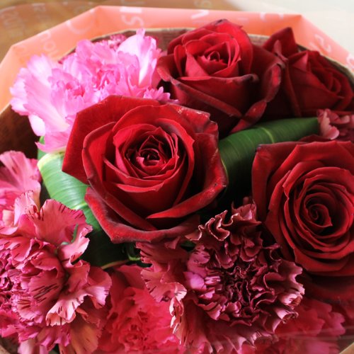 〔エルフルール〕バラ、カーネーション花束 ブーケータイプ レッド×ピンク クリスマス プレゼント 結婚記念日 誕生日 フラワーギフト 母の日 花