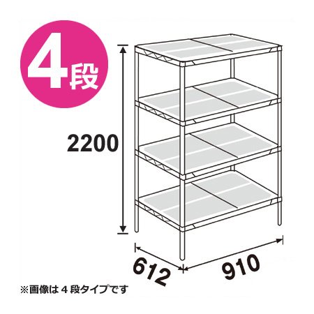●サイズ:約 幅910×奥行612×高さ2200mm●重量:約 26.8kg●付属品:テーパー:棚板1枚に付き4組●段数:4段●耐荷重:363kg(分散荷重)/棚1段(間口1220mmの場合)●マットの形状:グリッドマット(メッシュ)