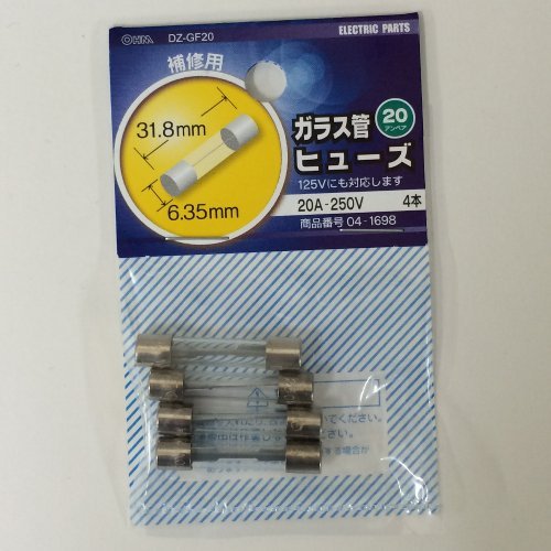 OHM ガラス管 ヒューズ 20A-250V 4本 (04-1698)