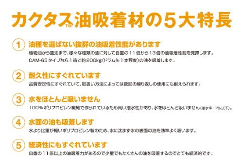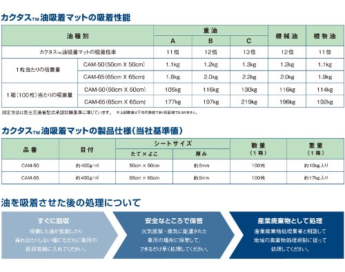 - 吸着倍率:重油A 11倍,重油B 12倍,重油C 13倍,機械油 12倍,植物油 11倍