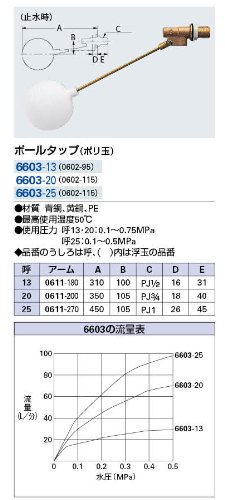 ●【用途】トイレタンク内の給水・止水。●【機能・特長】水位の上下変動により給水の開始・停止を自動的に行います。ポリ玉です。●【材質】黄銅。青銅。PE。