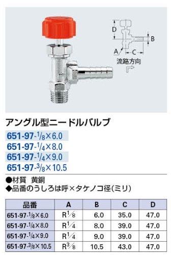 水栓材料 カクダイ アングル型ニードルバルブ 【651-97-1/8X6.0】