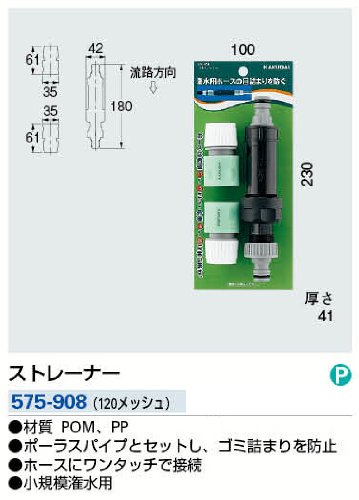 ●【用途】小規模潅水用。●【機能・特長】ポーラスパイプとセットし、ゴミ詰まりを防止しします。ホースにワンタッチで接続します。●【材質】POM。PP。