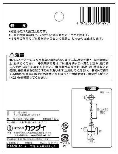 カクダイ バス用ゴム栓くさりつき 28×23 491-150