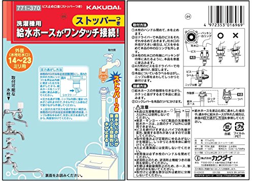 ●【用途】洗濯機用ニップル。●【機能・特長】水栓と洗濯機給水ホースの接続アダプターで、水栓吐水口の外径14ミリ~23ミリ用でビス止め式です。自動閉止機構付きです。●POM。