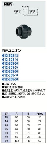自在ユニオン612-308-16【仕様】●材質:PVC●塩ビ配管接着用●使用温度:45℃以下、使用圧力:0.98MPa以下●屋内配管には使用しないでください。 ●呼称16