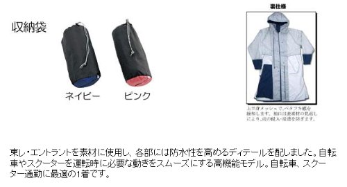 - 仕様:防水、撥水加工、透湿、メッシュ(内側)、ベンチレーション(背中部分)、リフレクター(胸部分)、袖口調節、ジャケット裾ドローコード、三角マチ(コート前裾に三角布を付け、自転車にも無理なく乗れ雨や風が入ることを防ぎます)