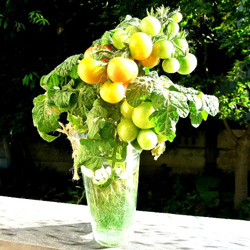 窓辺に置ける15cm~20cm程度の草丈で、条件さえ良ければ直径2.5~3cmのトマトを40~50個収穫することが出来ます。赤くなると食べる事もできますし、鑑賞用にもなります。