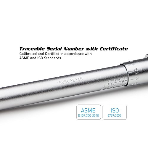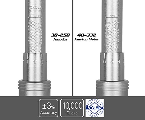 Premium components and advanced technology for daily long-term industrial use;1/2 inch drive with torque range of 30-250 ft.lbs or 48-332 Newton Meters;Engraved dual torque scale markings (no fading) and bi-directional calibration;Certificate of calibration included with individualized traceable serial number;All steel body and non-slip knurled handle for maximum grip