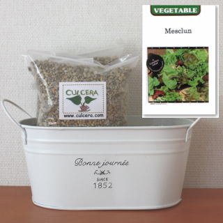 ベランダガーデニング用に開発されたセラミック製土【カルセラ】とプランター・種がすべてセットになった栽培セットです。ベランダや室内で栽培できます。初心者にも簡単なベビーリーフ(西洋七草)。種を蒔く時期は、3月-10月です