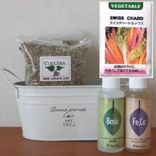 ベランダガーデニング用に開発されたセラミック製土【カルセラ】とプランター・種・液体肥料がすべてセットになった栽培セットです。ベランダや室内で栽培できます。初心者にも簡単なベビーリーフ(スイスチャードミックス)。種を蒔く時期は、3月-10月です