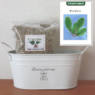 ベランダガーデニング用に開発されたセラミック製土【カルセラ】とプランター・種がすべてセットになった栽培セットです。ベランダや室内で栽培できます。初心者にも簡単なベビーリーフ(デトロイト)。種を蒔く時期は、3月-12月です