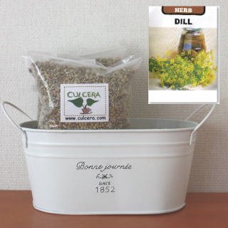 ベランダガーデニング用に開発されたセラミック製土【カルセラ】とプランター・種がすべてセットになった栽培セットです。ベランダや室内で栽培できます。初心者にも簡単なディル。種を蒔く時期は、3月-6月 9月-11月です